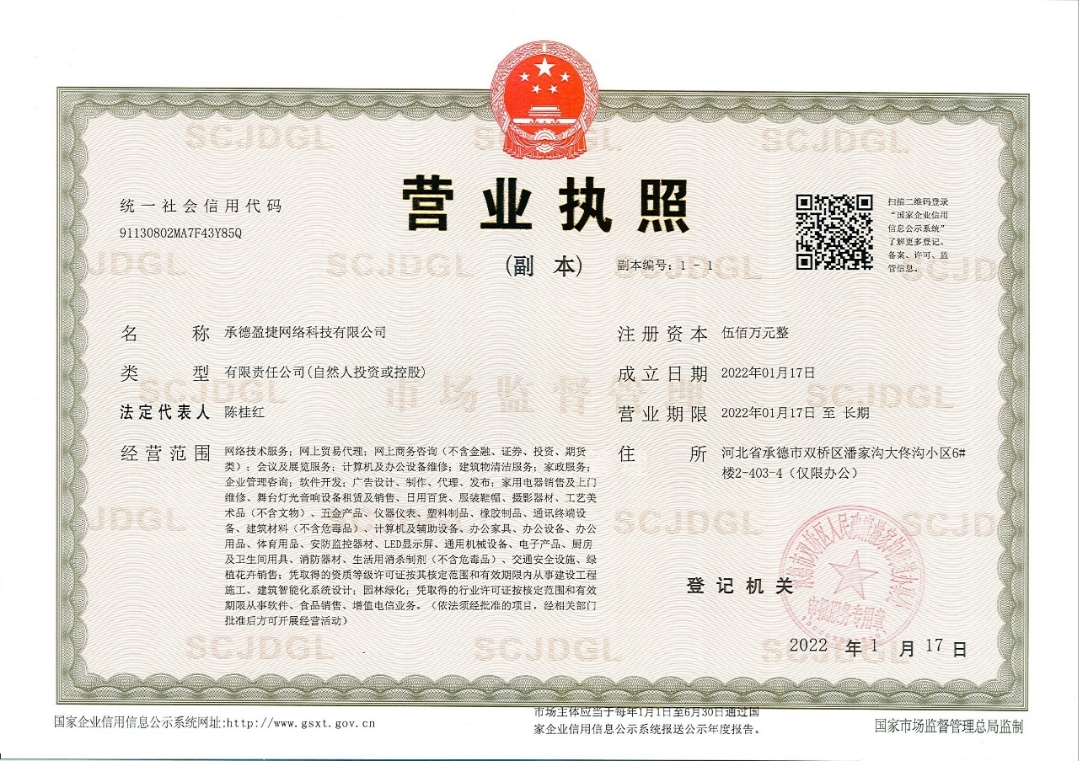 承德盈捷网络科技有限公司是一家专业化、规范化的现代企业。公司注册资本人民币500万元。公司本着“以人为本,追求诚信,规范管理,追求卓越”的企业宗旨,立足于为客户服务的前沿,以战略发展的眼光,对内致力于强化企业内部管理,实现管理创新,为客户提供优质的产品与服务;对外公司重品牌、重口碑、重形象,与更多的客户发展和建立良好的合作关系, 提供全方位的服务,以满足客户的需求,实现“创新是根本,质量是生命,务实是宗旨,效益是目标”的经营理念。